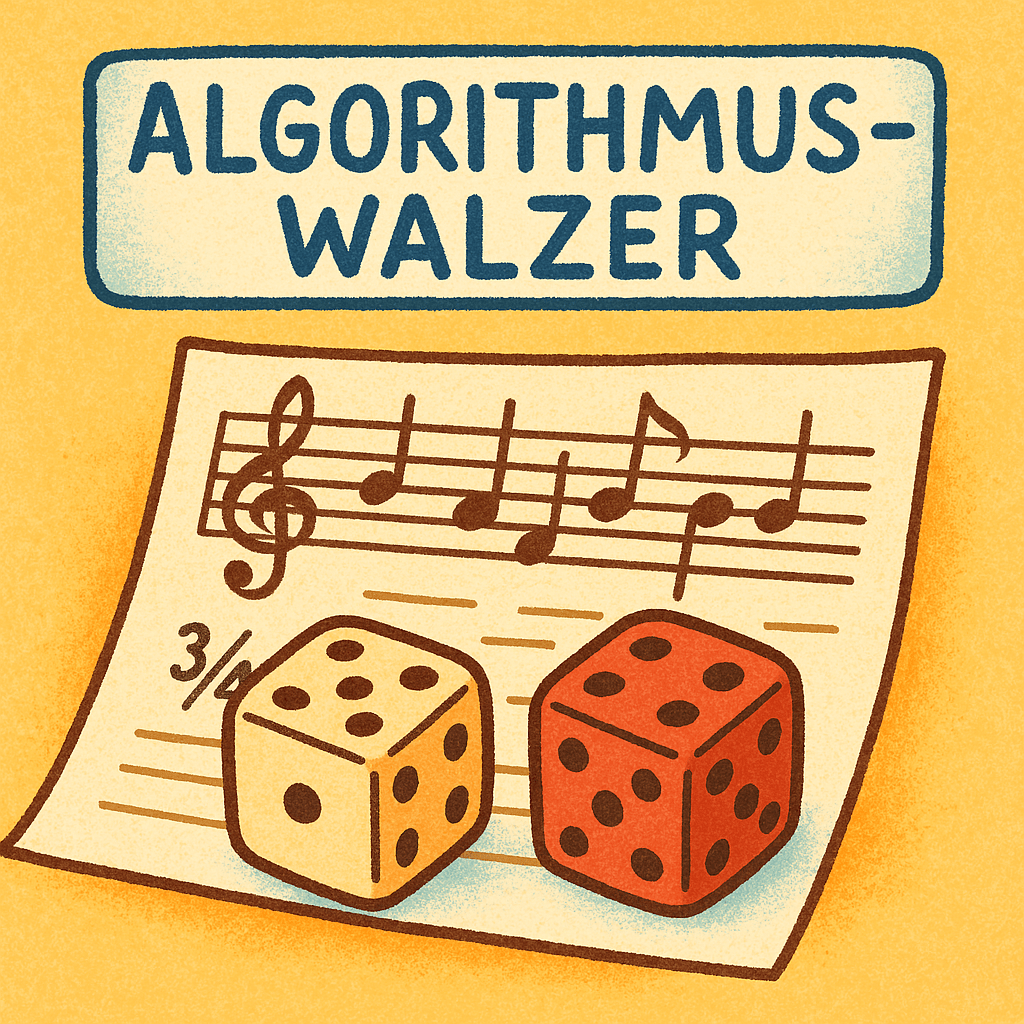 Sprecher: „Probieren wir’s aus. Ich würfle 16-mal. Die Zahlen ergeben eine Reihe aus Takten. Daraus entsteht ein Walzer – mein persönlicher Algorithmus-Track. Übrigens: Wer mag, kann die Beschreibung bei einer KI-Musikplattform eingeben und hört sofort, wie der Algorithmus klingt.“