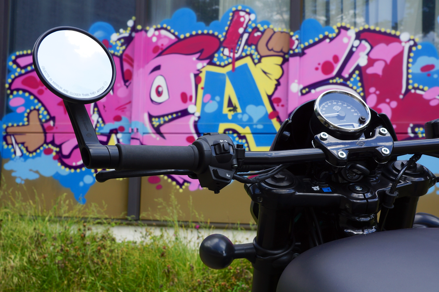 Auf der sofort sichtbaren Habenseite hat die Street Rod ihren wirklich coolen Look. Eine zierliche Lampenmaske gehört ebenso dazu wie der gerade Lenker, an den Lenkerenden befestigte Rückspiegel, ein kleines Zentralinstrument mit Chromumrandung, hintere Federbeine mit rund 30 Prozent mehr Federweg, geschmiedete Schalt- und Brems-Fußhebel, eine stark konturierte Sitzbank sowie zahlreiche mattschwarze Akzente. Allen voran die wohlklingende Auspuffanlage, die einen satten, markentypischen V2-Sound ins Freie entlässt. Bereits mit Serien-Auspuff klingt die 750er-Harley wie eine ihrer weitaus hubraumstärkeren Markenschwestern.