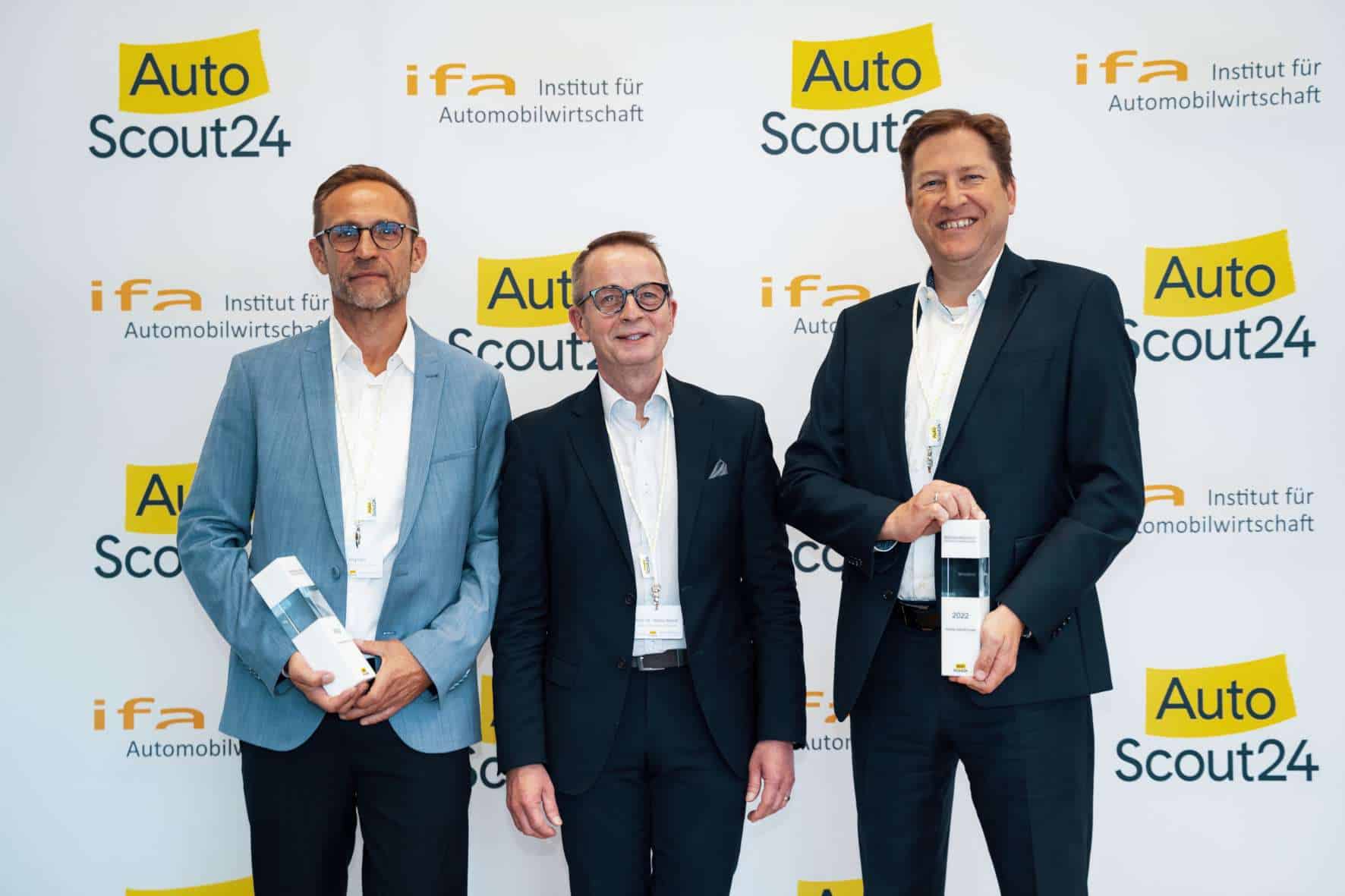 Ausgezeichnet (v. l.): Jörg Lenz, Mitsubishi Partnerverband, Stefan Reindl, IfA und Jens Schulz, Bereichsleiter Vertrieb, Mitsubishi Motors in Deutschland.