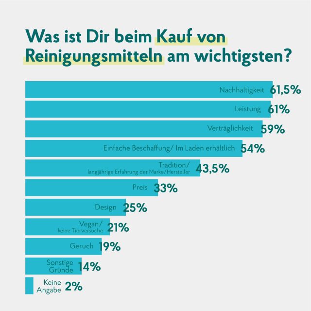 Für 86,5 Prozent der Deutschen ist das Thema Nachhaltigkeit längst fester Bestandteil des Alltags, besonders dann, wenn es um den Einsatz von Putzmittel geht. Für die Hälfte der Befragten ist die Nachhaltigkeit dabei das wichtigste Kaufkriterium. Mehr als die Hälfte der Befragten legt vor allem Wert auf die Inhaltsstoffe, gefolgt von einer umweltschonenden Verpackung, kurzen Lieferwegen, geringer Dosierung und weniger Verpackungsmüll.