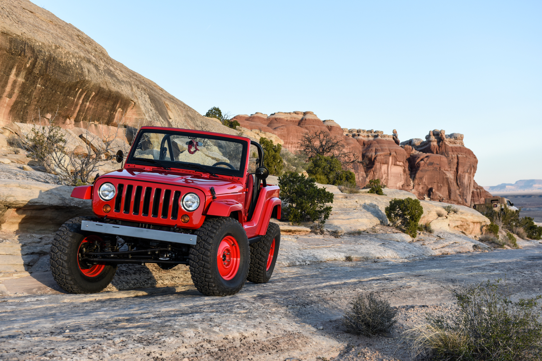Nach dem Motto „weniger ist mehr“ verkürzten die Ingenieure einen zweitürigen Wrangler um 66 auf 351 Zentimeter, beließen den Radstand jedoch bei 243 Zentimeter. Durch minimalistisch ausgeführte Stoßfänger und den Verzicht aufs Reserverad wurden nochmals ein paar Zentimeter eingespart. Und schließlich wird auf Türen und Dach ganz verzichtet. Das nahezu nackte Auto steht auf 17 Zoll-Stahlrädern mit 37 Zoll großen Schlammreifen von BFGoodrich, die sich über Dana 44 Achsen mit 5 Zentimeter verlängerten Federwegen abstützen.