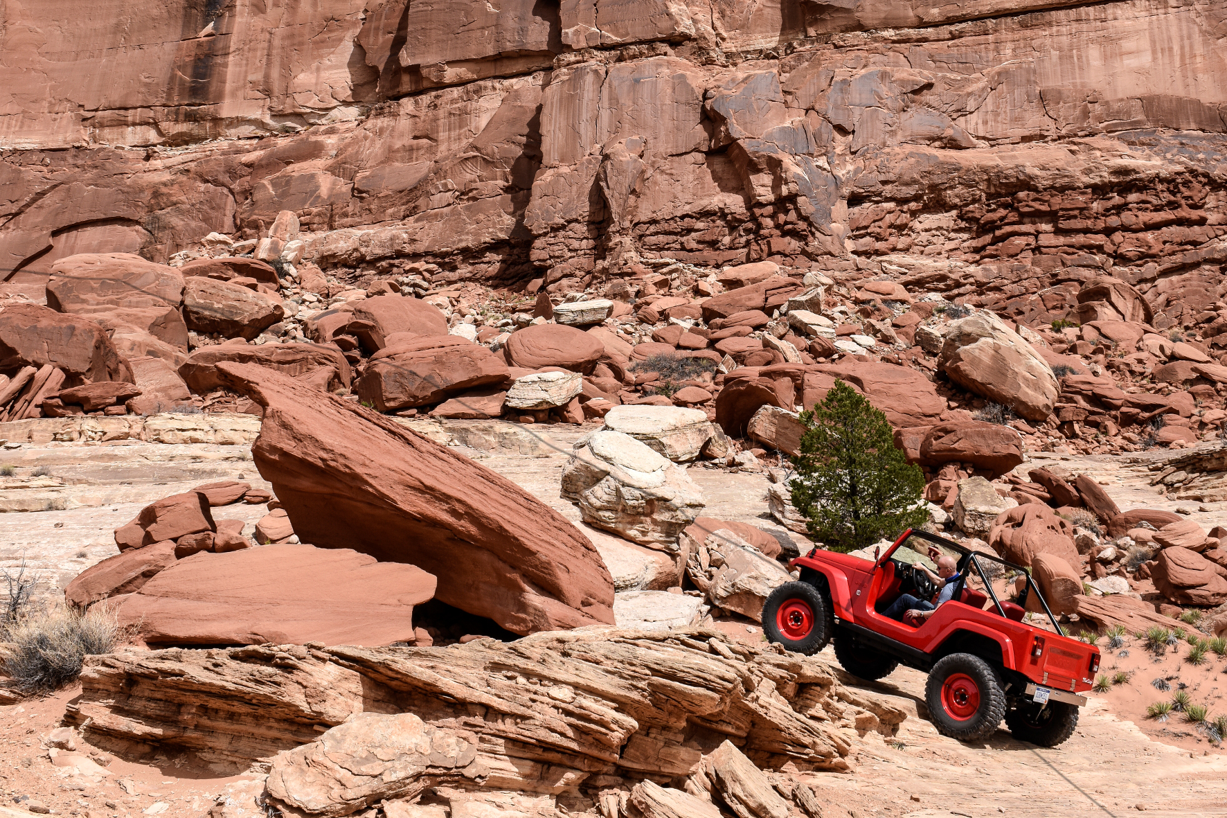 Angetrieben von einem serienmäßigen V6-Aggregat mit 3,6 Liter Hubraum in Kombination mit einer Fünfgang-Automatik fährt der Shortcut wie ein Wrangler vor, der gerade vom Fließband tropfte. Nur eben befreit von allem, was nicht der Fortbewegung im Gelände dient. Doch halt: zwei Airbags und Sicherheitsgurte überlebten die Diät, nicht aber die Kopfstützen. Die niedrigen Rückenlehnen der rot gemusterten Sitze im Retro-Look sind stilechte Repliken aus den 50er-Jahren. Ob das Abspecken wirklich soweit gehen muss, werden wir sehen, wenn Jeep beginnt, seine ikonenhafte Wrangler-Baureihe aufzufächern. Die ersten Reaktionen der Jeep-Gemeinde auf den Shortcut sollten die Marken-Verantwortlichen überzeugen: Sie reichen von „Sofort bauen“ bis „Alles sollte abwaschbar sein“. Zweifel am Erfolg des puristischen Wrangler gibt es nicht. Diese sind allerdings von der deutschen Zulassungsbehörde zu erwarten, die weniger Verständnis für automobile Ikonen aufbringt als ihr nordamerikanisches Pendant. Vielleicht sollten deutsche Prüfer zum 76. Geburtstag der Marke die Canyonlands bereisen… Natürlich in einem Jeep.