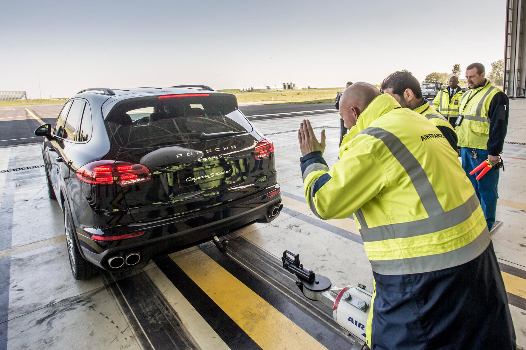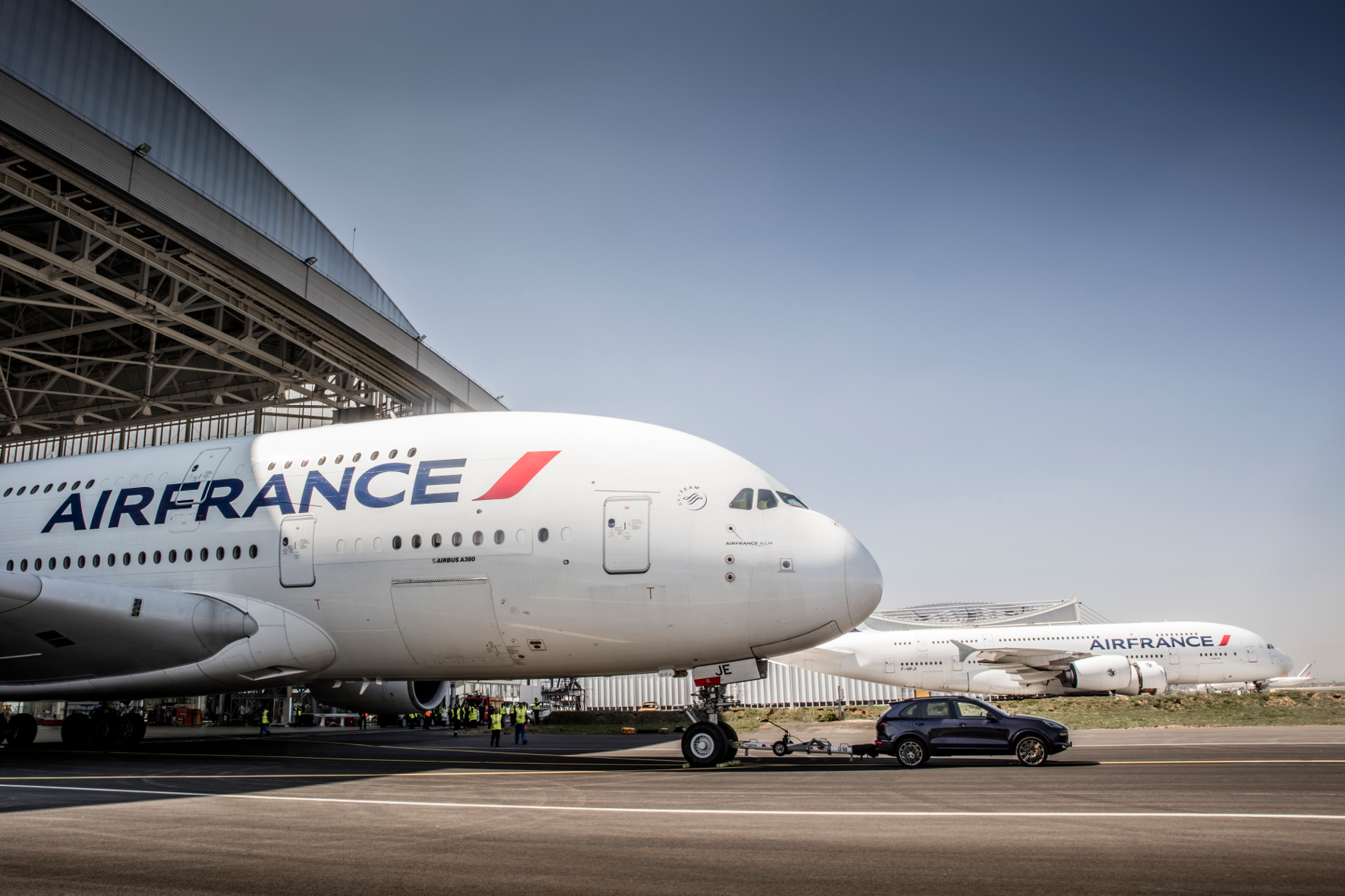 Aber die Aufgabe, die das pechschwarze Fahrzeug aus Stuttgart bewältigen soll, scheint unlösbar. Denn der Cayenne soll den XXL-Flieger aus dem Hangar hinaus über das Rollfeld ziehen. Wie bitte? Wie soll das denn gehen? Vor allem mit gründlicher Vorbereitung. Und deshalb hat Porsche das Projekt generalstabsmäßig geplant.Doch ohne die Hilfe der französischen Fluggesellschaft Air France ist die riskante Zugnummer nicht möglich. Die Airline stellt ihren modernen Hangar in Paris und eines ihrer zehn A380-Flugzeuge für dieses Projekt zur Verfügung. Klar: Ein bisschen Werbung kann nie schaden, denn der Schriftzug der Fluglinie ist nicht zu übersehen. In den 60.000 Quadratmeter großen Hangar passen übrigens 3.000 Modelle des Cayenne. Er wurde speziell für die Unterbringung des Air France Airbus A380 gebaut und beherbergt normalerweise alle Ingenieurs- und Wartungstätigkeiten der Air-France-Flotte.