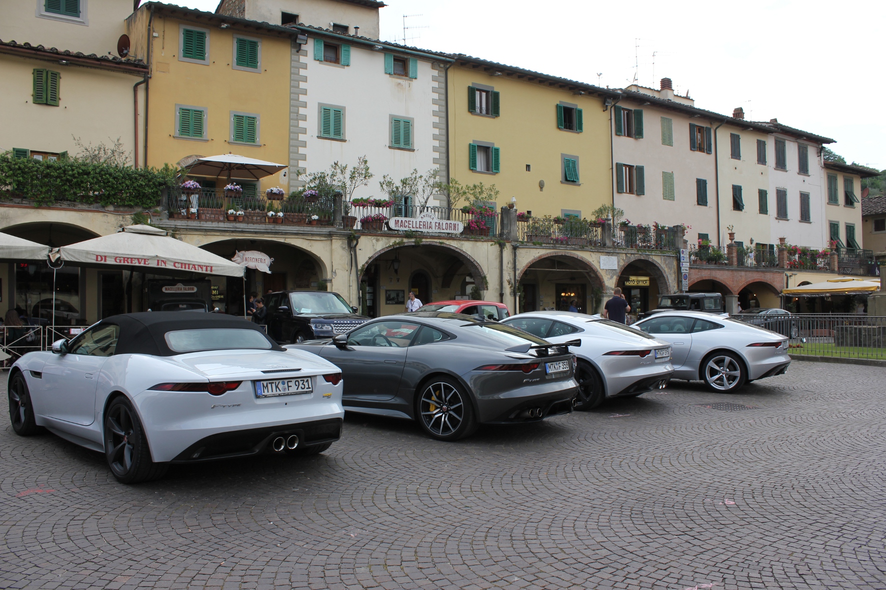 Wir rollen in vier Exemplaren des neuen 2018er-Modelljahres auf die Piazza Giacomo Matteotti im kleinen Städtchen Greve in der Toskana. Das Quartett legt eine Verschnaufpause auf diesem ganz speziellen Giro d’Italia über mehr als 1.100 Kilometer ein, und sofort schart sich eine Traube von Menschen um die Attraktion des Tages. Etliche Passanten schlendern während dem kurzen Stopp um die Fahrzeuge, lachen, strecken den Daumen nach oben und machen Fotos von sich und den formschönen Wildkatzen. „Das ist doch der Jaguar-Sportwagen, oder? Sehr schön, der könnte fast aus Italien kommen“, sagt ein Einheimischer mit einem Augenzwinkern. Ein größeres Kompliment hätte er der bella macchina von der Insel wohl kaum machen können.