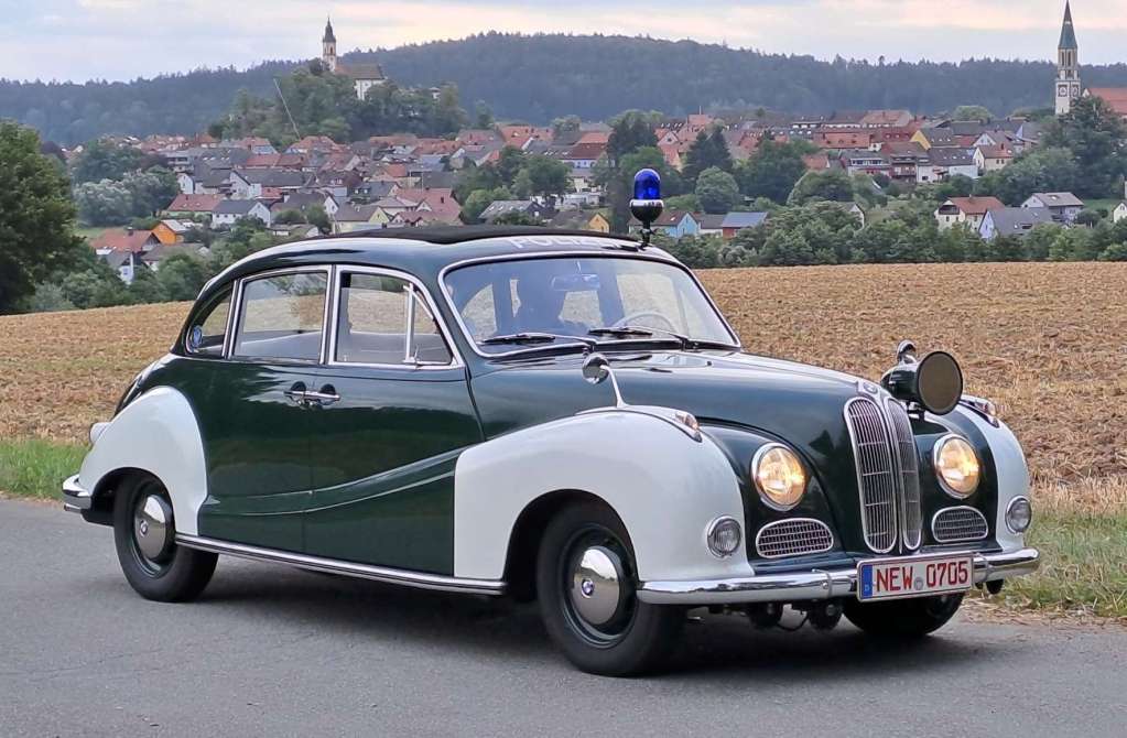 (TRD/MID) Es steht nicht irgendwo, sondern bei Harald Schmid in Pleystein in der Oberpfalz. Der Leiter der Zentralwerkstatt der Bayerischen Bereitschaftspolizei in Sulzbach-Rosenberg, der auch als Restaurator von Oldtimern tätig ist, verlieh dem authentischen Scheunenfund ein neues Leben. Der BMW 501/502, der erste Personenwagen der weiß-blauen Marke aus München nach den Modellen aus Eisenach, wurde von 1952 bis 1963 in einer Auflage von etwas mehr als 23.000 Exemplaren produziert. Diese repräsentativen, viertürigen Limousinen der Oberklasse dienten auch als Einsatzfahrzeuge bzw. Streifenwagen bei Feuerwehren und der Polizei.