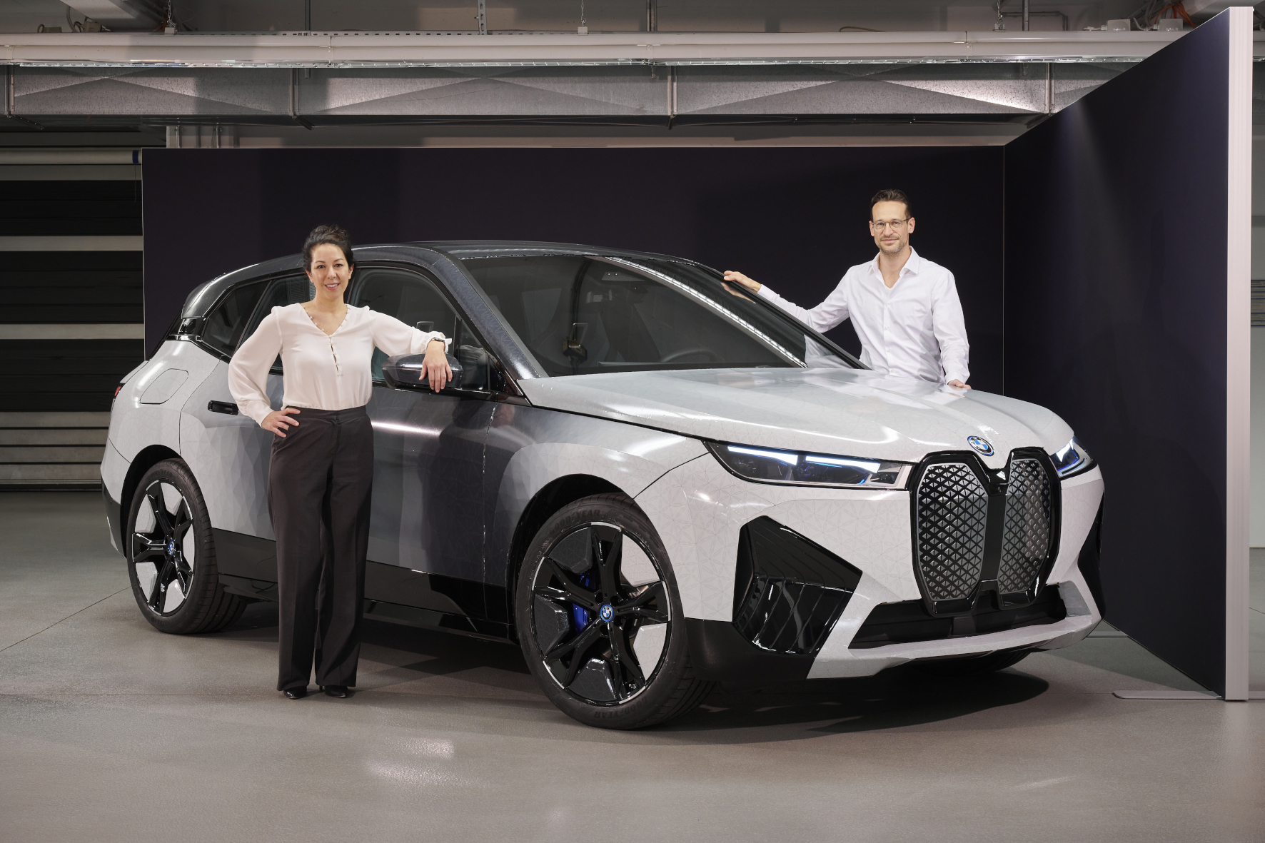Stolz auf ihr Chamäleon-Auto: Stella Clarke, Projektleiterin BMW iX Flow featuring E Ink und Dirk Müller-Stolz, Leiter BMW i Exterieur-Design mit dem BMW iX Flow.
