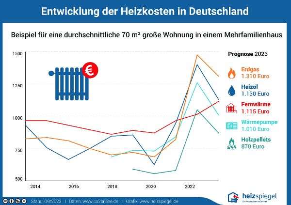Für das laufende Jahr erwartet co2online leicht niedrigere Heizkosten, weil die Energiepreise wieder sinken. Laut der Auswertung wird Heizen mit Gas gegenüber 2022 um elf Prozent günstiger. Die Kosten fürs Heizen mit Holzpellets (- 17 Prozent) und Heizöl (- 19 Prozent) gehen ebenfalls zurück. Am stärksten sinken die Kosten fürs Heizen mit Wärmepumpe (- 20 Prozent). Grund dafür ist ein wieder größeres Angebot an Wärmepumpen-Stromtarifen. Lediglich für Fernwärme werden Kunden 2023 voraussichtlich mehr bezahlen müssen (+ zehn Prozent).