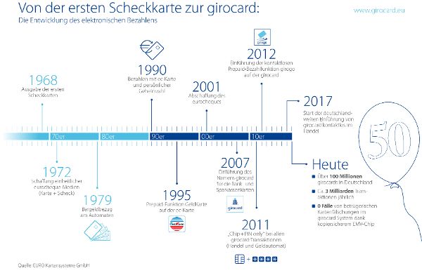 Die ursprüngliche Garantiekarte ohne eigene Bezahlfunktion wurde bereits 1979 um eine erste Debit-Funktion erweitert: Fortan konnten Kunden mit ihr an Geldautomaten der Banken und Sparkassen Bargeld beziehen. Das deutsche Geldautomatensystem war geboren. Bis zur ersten Zahlung direkt mit der Karte im Handel war es jedoch noch ein weiter Weg. 1990 hieß es dann an der Ladenkasse erstmals „Mit Karte, bitte“. Für Sicherheit sorgte dabei schon ab der ersten Transaktion die PIN. Seit 2011 werden alle Transaktionen im Girocard-System ausschließlich über den fälschungssicheren EMV-Chip abgewickelt.