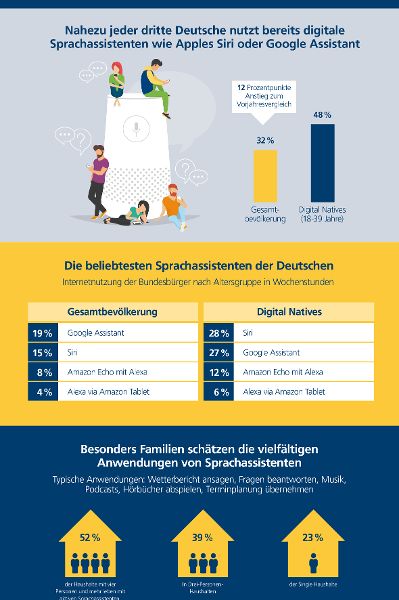 Bei den Jüngeren im Alter unter 40 Jahren spricht demnach fast jeder Zweite (48 Prozent) mit Siri, Googles Assistant oder mit Alexa. In der Verbreitung liegt der Umfrage zufolge der Google Assistant mit 19 Prozent vorn, gefolgt von Apples Siri (15 Prozent) und Amazons Echo-Lautsprechern mit Alexa (8,0 Prozent).