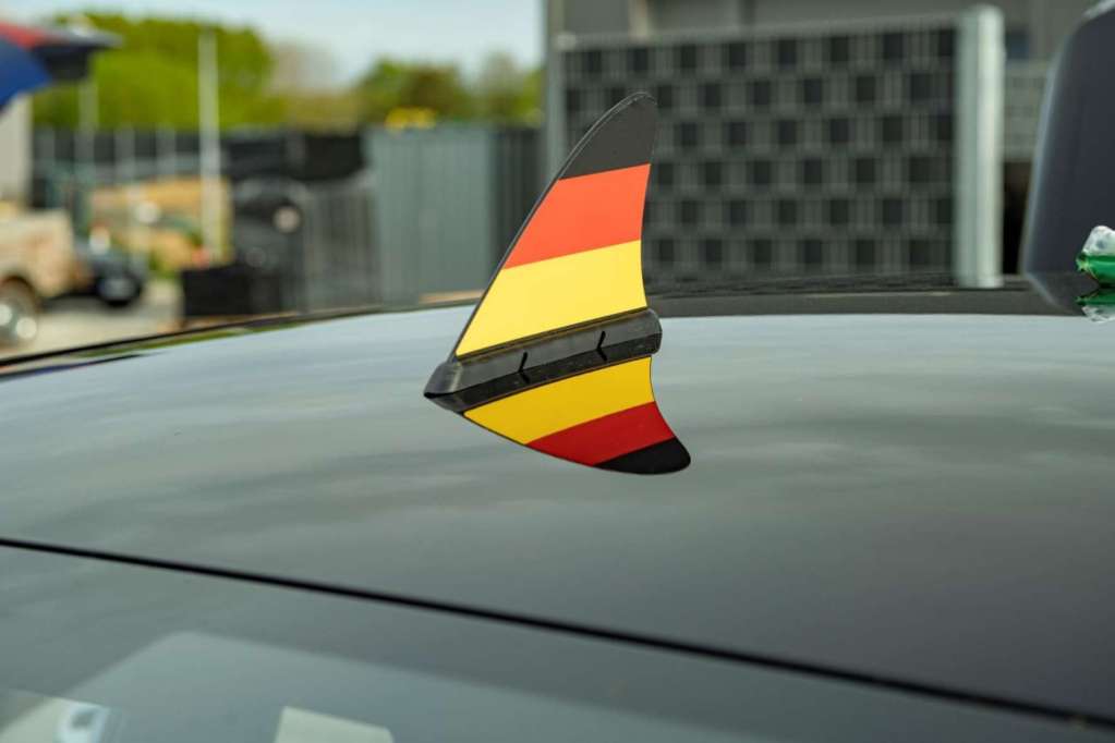 Bunte Fanflossen werden mit einem starken Magneten auf dem Autodach platziert. Die Testflosse ist zugelassen für 180 km/h; empfohlen wird die Richtgeschwindigkeit von 130 km/h. Auf der Teststrecke bewegte sie sich nicht. Trotzdem ist sie nach Einschätzung von ACE und GTÜ nicht für die Autobahn geeignet: Sitzt sie nicht gerade oder gibt es starke Seitenwinde, kann die Flosse abfallen und zum gefährlichen Geschoss werden.