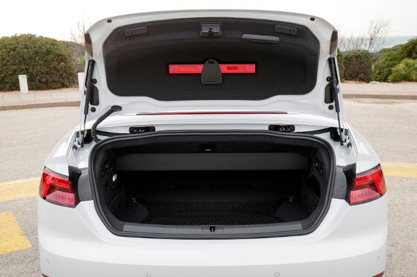 Mit zwei Besonderheiten macht Audi den Cabriofans eine ganz besondere Freude. Da ist zunächst einmal der automatisch auf und ab fahrende Verdeckkasten im Kofferraum. Wer vor der Fahrt in den Urlaub oder ins verlängerte Wochenende wissen will, ob er Kofferraum nicht bereits zu vollgestopft ist, um das Dach zu noch öffnen, kann den Kasten mittels Knopfdruck probehalber absenken und mit dieser Aktion im Gepäckfach maßnehmen. Im Maximalfall fasst der Frachtraum 380 Liter. Wenn das Verdeck dort verstaut ist, dann bleiben immerhin noch 320 Liter übrig. Das zweite Schmankerl ist die Antippfunktion für den Schalter des elektrischen Verdecks. Das Öffnen und Schließen geht sogar bis Tempo 50. Einmal kurz ausgelöst, und schon fährt der Eigner des Audi A5/S5 innerhalb von 15 Sekunden der Sonne entgegen – mit großer Eleganz.