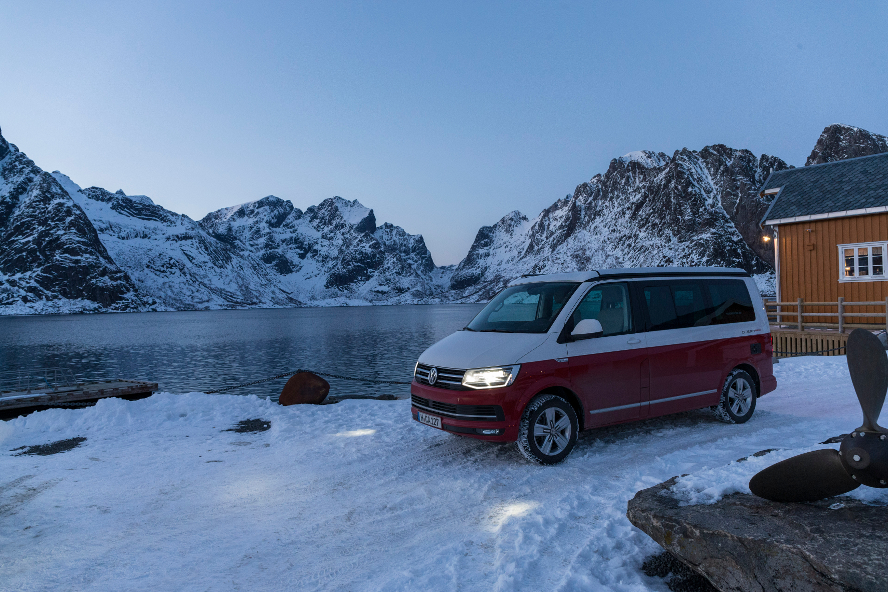 Zunächst ein paar Eckdaten zu unserem Fahrzeug. Der 2,0-Liter-Turbobenziner leistet 150 kw/204 PS, ein DSG-Doppelkupplungs-Getriebe übernimmt die Kraftübertragung und leitet sie an alle vier Räder, auch eine mechanische Differentialsperre ist an Bord. Der Preis: 85.905 Euro in der Variante Ocean Red. Den Verbrauch für den TSI gibt VW mit 9,6 Liter für 100 Kilometer kombinierte Fahrt in der Stadt und über Land an. Beim reinen Fahren haben wir diese Angabe unterboten. Am Ende des Trips liegen wir doch etwas drüber. Fahrten über Eis und Schnee und das Dauerbrennen der Standheizung machen offensichtlich durstig. Den vielen elektronischen Helferlein an Bord verdanken wir das mühelose Überqueren der schneebedeckten Lofoten und der vereisten Steigungen.