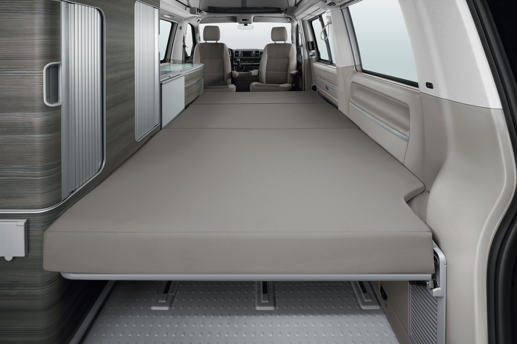 Die beiden Vordersitze des California lassen sich drehen, das schafft eine Menge Platz zum Richten der Schlafhöhlen. Unten wird einfach die Sitzbank vorgezogen und die Lehne umgeklappt – die Schlafauflage noch drüber, Schlafsack und Kissen draufwerfen, einkuscheln und fertig. Oben ist es noch einfacher: Das Faltdach öffnet sich elektrohydraulisch. Nur raufklettern, einkuscheln und Gute Nacht. Übrigens lässt sich der Boden des oberen Bettes hochklappen, sodass man im Camping-Bulli aufrecht super stehen kann.