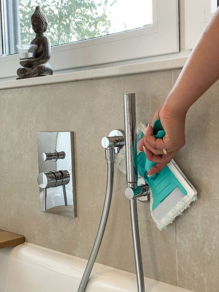 Weiter geht es zum Waschbecken, Badewanne und Dusche sowie den Fliesen. Hier kommt oft ein weiteres Hilfsmittel, der Reinigungsprofis, wie der Bath Cleaner micro duo Telescope 125 zum Einsatz. Er eignet sich speziell für die Reinigung von Fliesen und Wänden in Bad und Dusche. Durch eine integrierte Abziehlippe und die runde Aussparung für Armaturen gelingt damit die Reinigung der Fliesen ohne großen Kraftaufwand und mühsame Fingerarbeit.