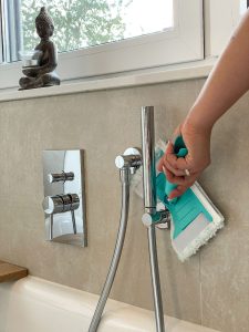 In den Fugen können sich mit der Zeit Ablagerungen sammeln, die zu Verfärbungen und schlimmstenfalls Schimmel führen. Daher sollte schon bei der Auswahl der Reinigungsprodukte von Fliesen auf Komfort geachtet werden: Wichtig dabei ist auch, dass das Wischpad neben der Mikrofaser, die den Schmutz aufnimmt, auch lange Borsten für eine tiefe und intensive Schmutzlösung hat. Foto: Leifheit/TRD Modernes Bad