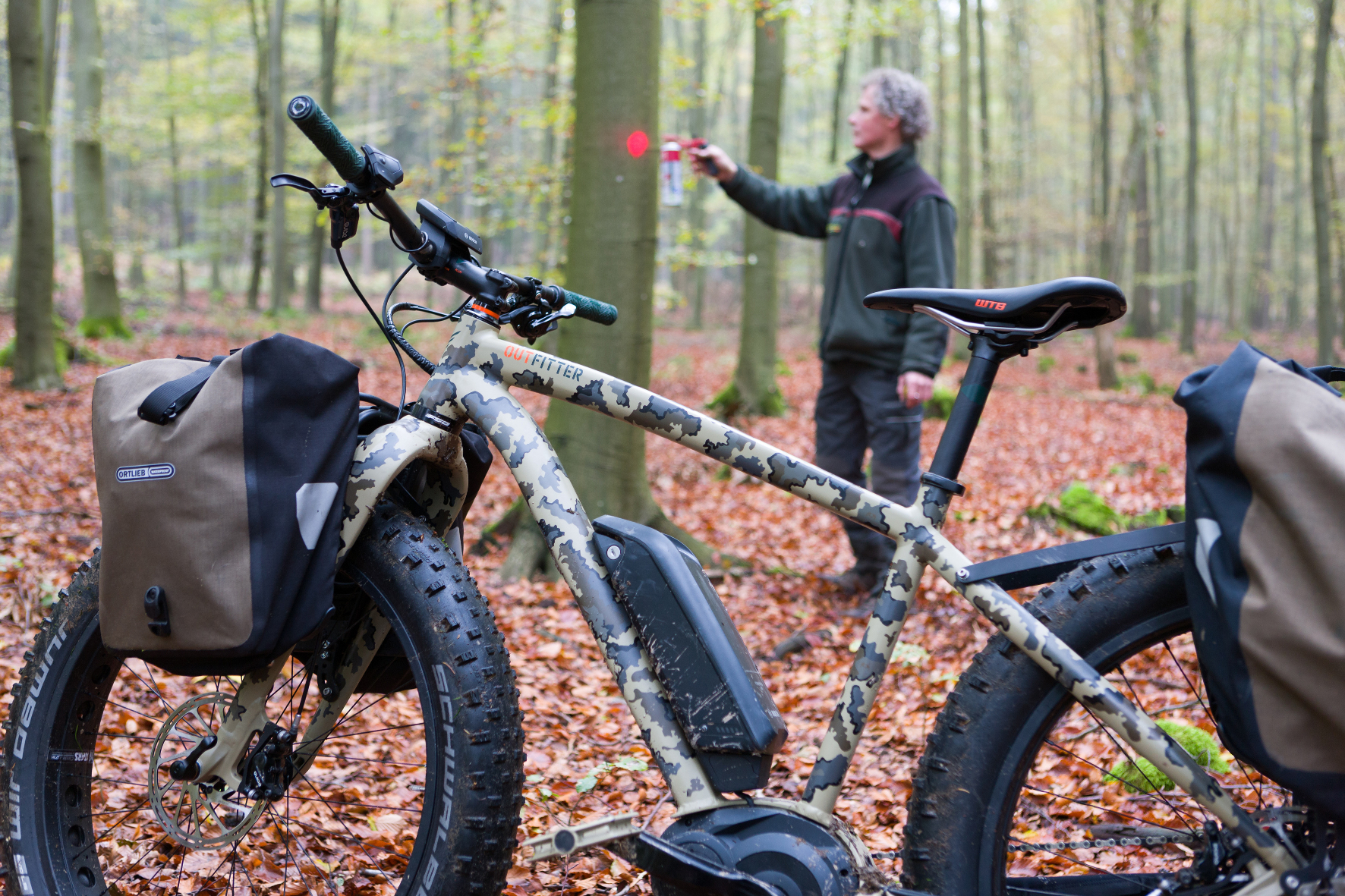 Die Ausfahrt mit den Förstern auf einem von einem Jäger für den Praxiseinsatz entworfenen E-Fatbike „Outfitter“ von Felt zeigt schnell, was die Chefs vom Forstrevier am Kindelsberg im Siegerland von den ungewöhnlichen Dienstfahrzeugen überzeugt hat: Ein, zwei Abbiegemanöver von der gut ausgebauten Forststraße, schon geht es auf schmalen und immer schmaleren Pfaden durch den Wald. „Das sind Verbindungswege, die schon vor Jahrhunderten für den Erztransport genutzt wurden“, so Uta Birkhölzer. „Mit einem Dienstwagen sind die nicht befahrbar.“ Auch bei der Reichweite gibt es trotz des deutlich höheren Stromverbrauchs im Wald keine Probleme: „Die 35 bis 50 Kilometer sind ausreichend für arrondierte Reviere. Ein Drittel aller Revierkilometer lässt sich mit dem E-Bike zurücklegen“.