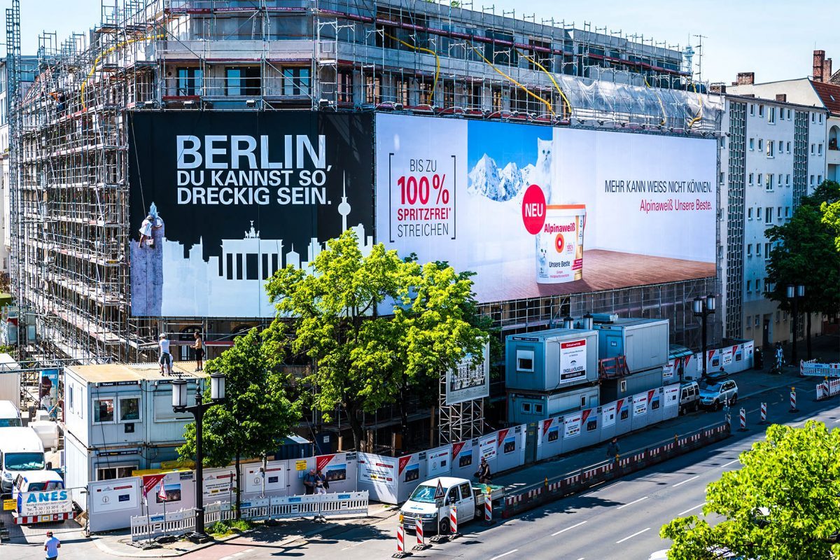 Um mit dem gängigen Klischee von der immer grauen Hauptstadt an der Spree gründlich aufzuräumen, seilten sich kürzlich zwei wagemutige Maler vom Gebäudedach am Berliner Kaiserdamm 116 ab. Ihre Aufgabe: Ein über 560 Quadratmeter großes Riesenposter (BlowUP) die Farbe wechseln zu lassen. Ein Teil des Posters zeigte die Großstadtsilhouette von Berlin, die in kürzester Zeit einen völlig neuen Anstrich erhielt und die Skyline von tristem Grau in ein strahlendes „Alpinaweiß“, das Premiumprodukt des Herstellers, verwandelte. Zum großen Finale musste dann der schwarze Hintergrund dem alles überragendem Slogan „Die neue Berliner Weiße“ weichen.