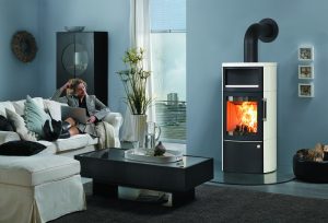 Kaminofen mit keramischen Feinstaubfilter. Verkleidung aus keramischen Ofenkacheln zur Wärmespeicherung.