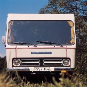 Rollende Schrankwand: Das Hymermobil 521 wurde mit absenkbarem Doppelbett (Hubbett) im Fahrerhaus verkauft. Daher musste die Front entsprechend breit ausfallen. © Hymer / TRD Reisemobil
