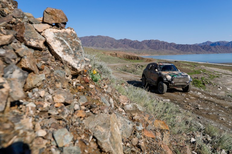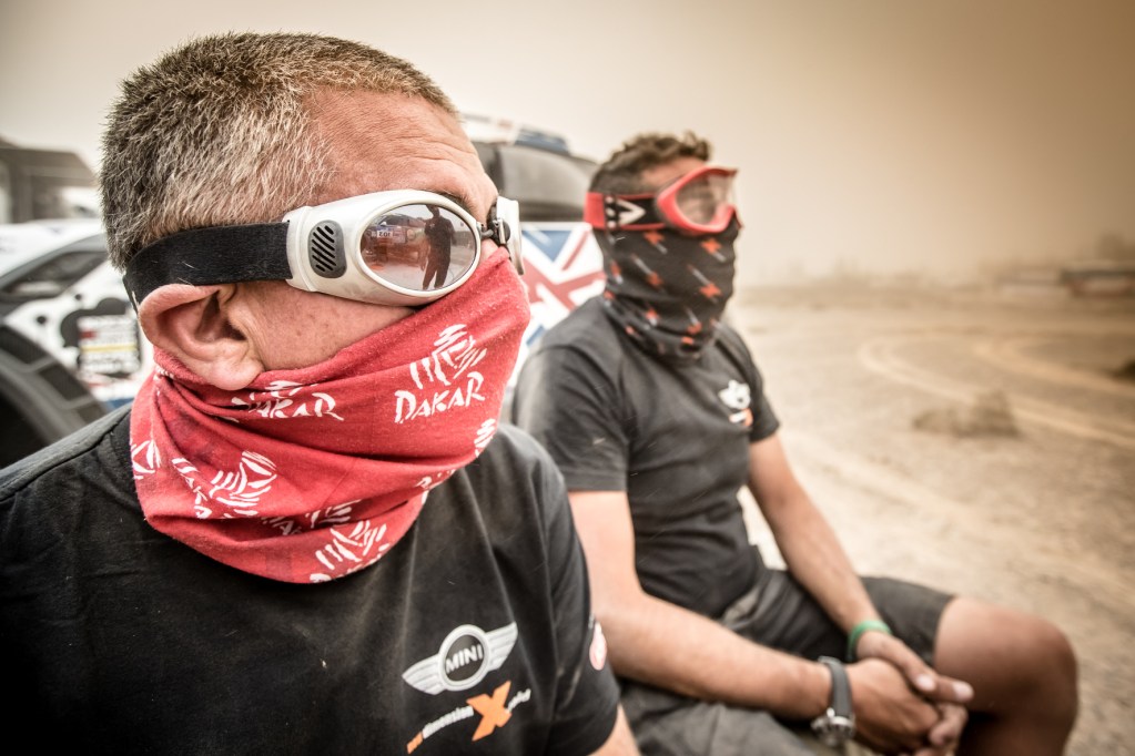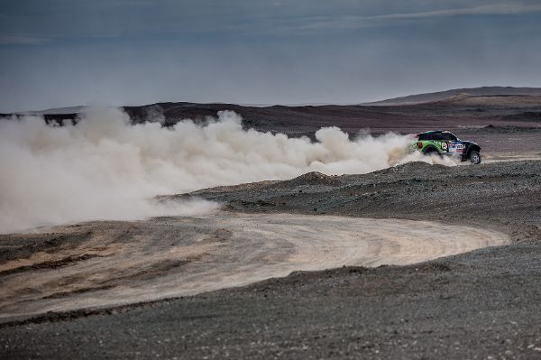 Laut brüllend pflügen die hochbeinigen MINI ALL4 Racing durch den Tiefsand, tauchen am Dünenfuß mit dem Bug bedrohlich tief ein, heben dann die Nase. Wie ein Wasserfall „duscht“ der feine Sand den Zweitürer, seine vier angetriebenen 245/80 R 16 Reifen graben eine tiefe Spur. Die Dünenkuppe wird oft übersprungen, dahinter stürzen die Monster ins Tal. Mit bis zu 180 km/h fliegen die MINI über Stock und Stein als gäbe es kein Morgen! Noch auf 50 Meter Distanz zu „Ross und Reiter“ glaubt man, das Krachen im Gebälk der Fahrzeugstruktur zu hören. Dann steht der Betrachter für Minuten im Staub und fragt sich, wie Technik und Mensch diese Tortur überstehen. Tagesetappen von 700 Kilometer sind keine Seltenheit.