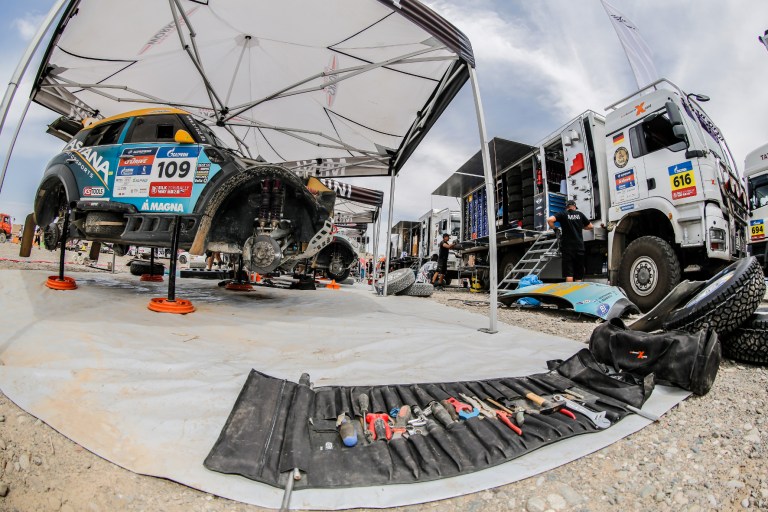 Parallel zum Renngeschehen arbeitet ein präzise aufeinander eingespieltes 43-köpfiges Technikerteam wie ein Uhrwerk im Hintergrund. Es präpariert Rennwagen und Racer für den morgendlichen Start und erwartet sie abends. In einem Sattelzug, zwei wüstentauglichen MAN T4A 26480 6×6 sowie Kleinbussen und BMW X5 Geländewagen führt X-raid von Trebur bis nach Beijing eine völlig autonome Kleinstadt mit, die abgesehen von MINI Chassis Ersatzteilen alles bunkert, was jedes Rennauto zweimal abbildet. Hinzu kommen 280 Rennreifen auf Felgen, eine komplette Mechaniker-Werkstatt sowie ein Offroad-tauglicher Küchenanhänger und einige hundert Liter Diesel.