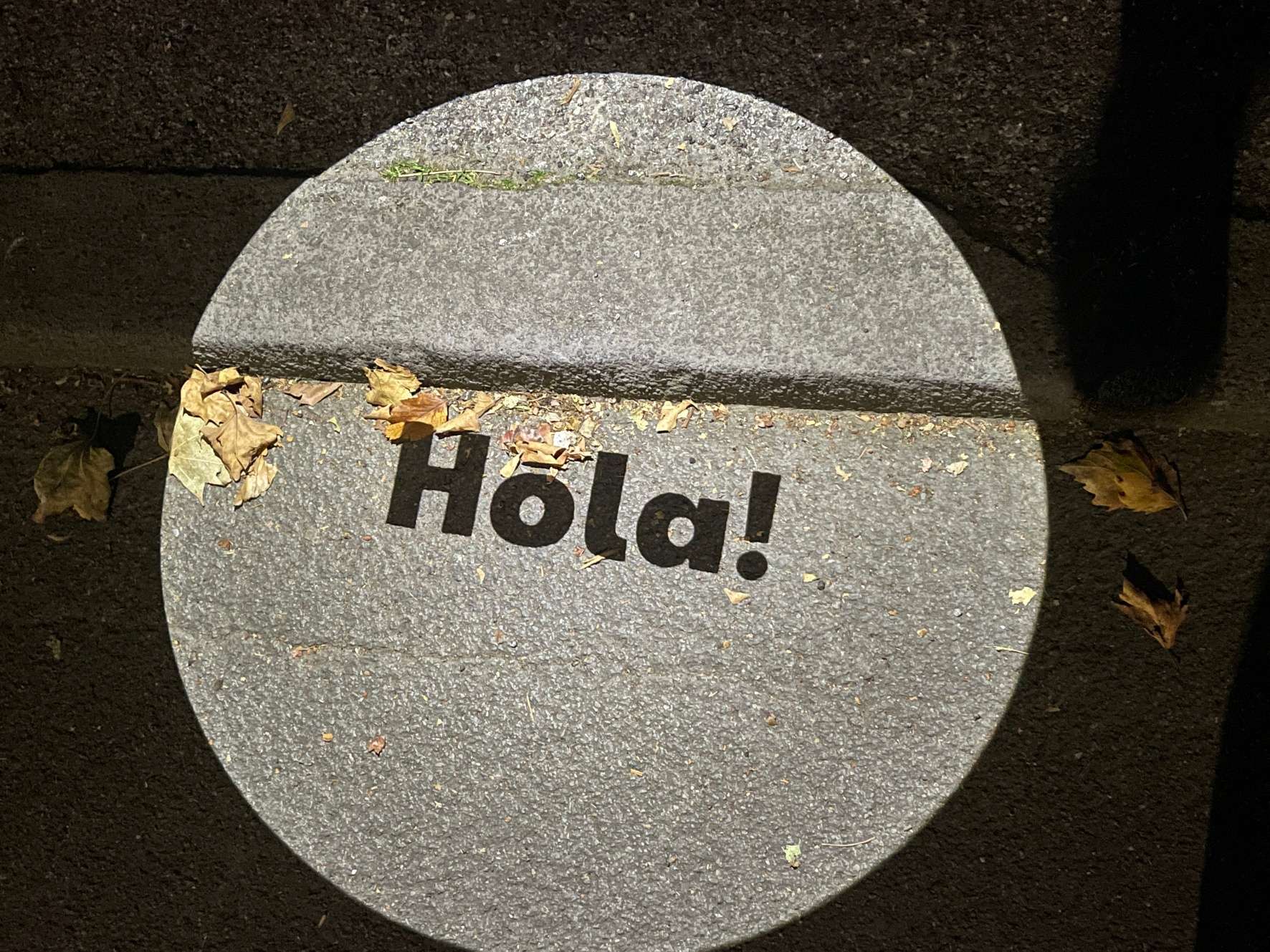 Die spanische Begrüßungsfloskel „Hola“ als Lichtprojektion auf den Boden unter den Außenspiegeln.