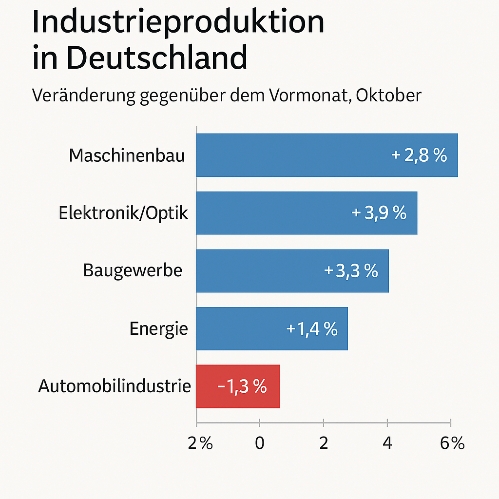 Deutschland hat im Oktober klare Fortschritte gezeigt – die strukturellen Herausforderungen bleiben jedoch bestehen. Gegenüber September stieg die Industrieproduktion um 1,5 Prozent, das gesamte Produzierende Gewerbe sogar um 1,8 Prozent. Besonders erfreulich entwickelten sich der Maschinenbau (+2,8 %), die Herstellung von Datenverarbeitungsgeräten, elektronischen und optischen Erzeugnissen (+3,9 %) sowie das Baugewerbe (+3,3 %) und die Energieproduktion (+1,4 %). Lediglich die Automobilindustrie verzeichnete ein Minus von 1,3 Prozent.