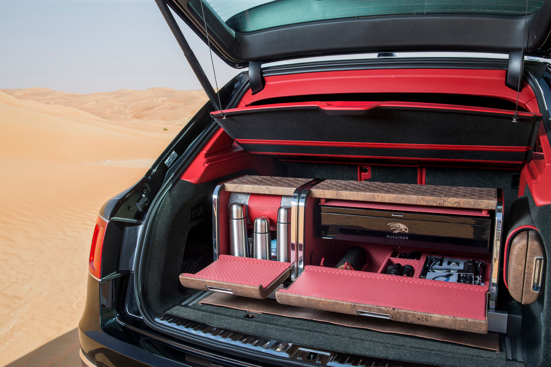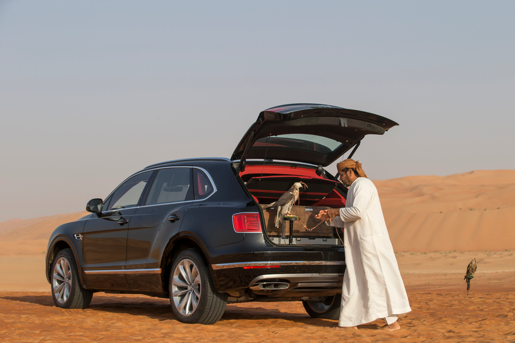 Beim Bentayga Falconry gehören dazu Startpodeste für die Falken, handgefertigte Lederhauben, eine Box, in der sich der Vogel ausruhen kann inklusive Trink- und Futternapf. Technik-affine Falken-Fans finden im Kofferraum außerdem Stauraum für ihr GPS-Tracking-Equipment – die Wertvollen Vögel, die zu Millionen-Preisen gehandelt werden, sollen in der Wüste schließlich nicht verloren gehen. Ein absolutes Highlight findet sich im Armaturenbrett: Ein Mosaik aus 430 Holzteilen zeigt eine Szene mit einem fliegenden Falken. Natürlich ist dieses Extra in jedem Auto ein Unikat.