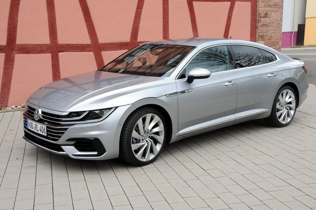 Der Bug wirkt wie ein einziger Kühlergrill mit stilistisch zur Einheit verbundenen, schmalen Scheinwerfern. Aus der flach stehenden Frontscheibe entwickelt sich in einem weit ins Heck fließenden Bogen die ewig lange Dachpartie. Harte Kanten in der Motorhaube und über die Schulterlinie an den Flanken geben dem Fahrzeug seinen eigenen Stil. So sieht kein anderer Volkswagen aus – auch nicht der Genspender Passat. Mit ihm teilt sich der Arteon die technische Plattform. Das sind zum Beispiel das Fahrwerk und die quer eingebaute Motor-Getriebe-Einheit.