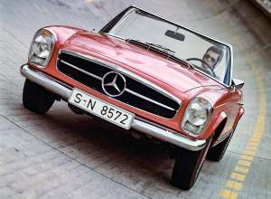 Mercedes-Benz 230 SL „Pagode“: Fahraufnahme in der Steilkurve der Einfahrbahn des Mercedes-Werks Untertürkheim.